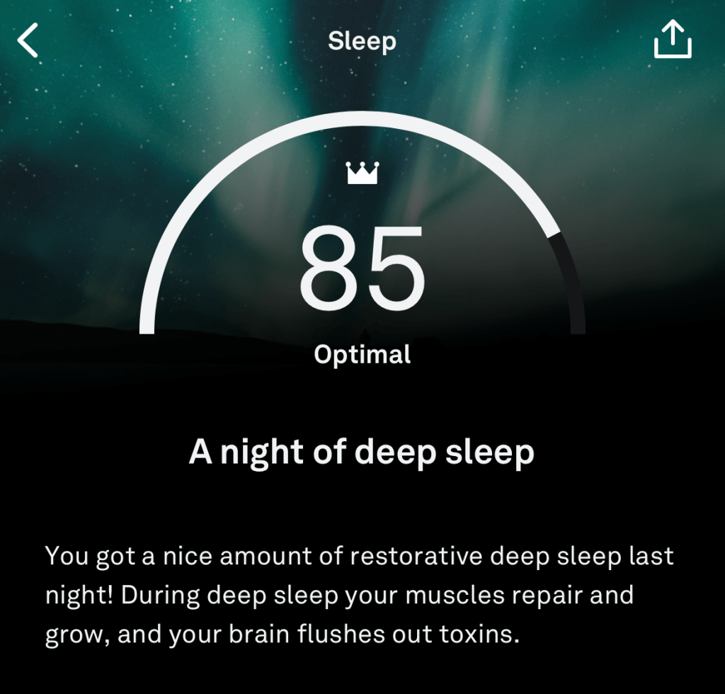 It analyzes your resting heart rate, body temperature and movement, and the time slept in each of the three sleep stages: light sleep, deep sleep, and REM sleep. A score over 85 qualifies as an optimal sleep score. The Oura ring will also track any naps which will also be added into your overall sleep and readiness scores for the following day.