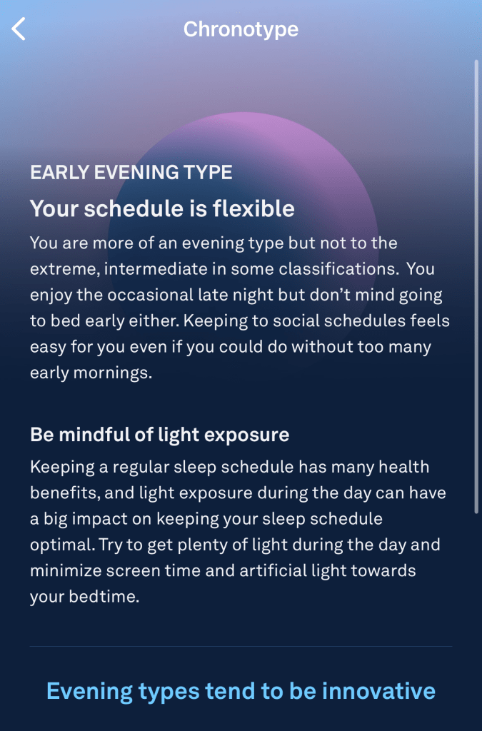Another good thing that the detailed sleep data can tell you is your Chronotype. It takes about three months worth of data, but then you will be able to see what the data tells you about your chronotype. A more general way of describing your Chronotype is if you are a morning or evening person. The way your Chronotype is derived is greatly from your genetic makeup, but also reflects your own circadian rhythm, or your body’s 24-hr clock that regulates your alertness, hormone release, and more.